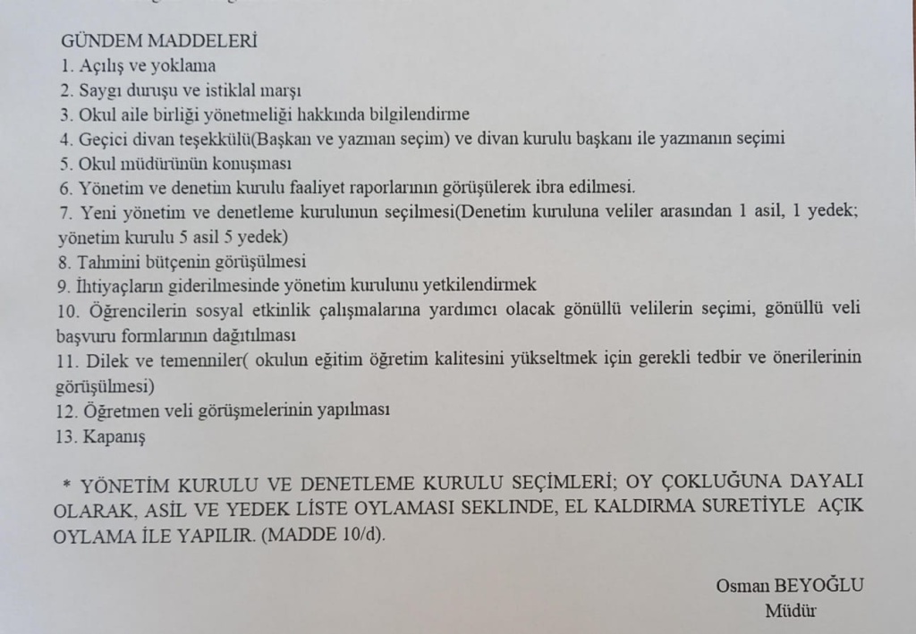 2025/2026 Eğitim Öğretim Yılı Sene Başı Okul Aile Birliği Toplantısı 14.10.2025 Salı Saat:15.00'te okulumuz konferans salonunda yapılacaktır. Tüm velilerimizin katılımlarını bekliyoruz.